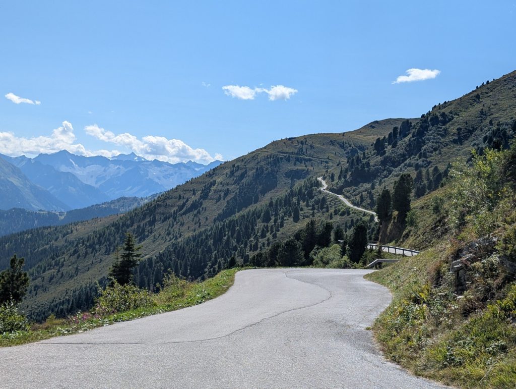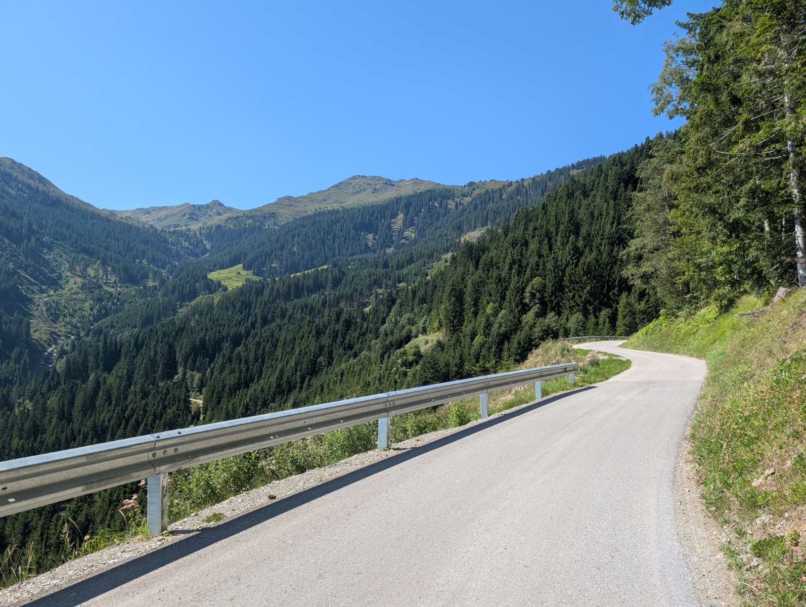 Mehr oder weniger wurde das Zillertal nur einmal gequert und schon ging es in den längsten zusammenhängenden Anstieg des Tages. 12,6km mit 1240hm. Sobald ich Ried im Zillertal verlassen hatte, nahm der Verkehr auch schnell ab. Nur noch einzelne Autos oder Motorräder waren unterwegs. Von Anfang an eine schöne Straße, oben rum allerdings wurde es immer besser.
