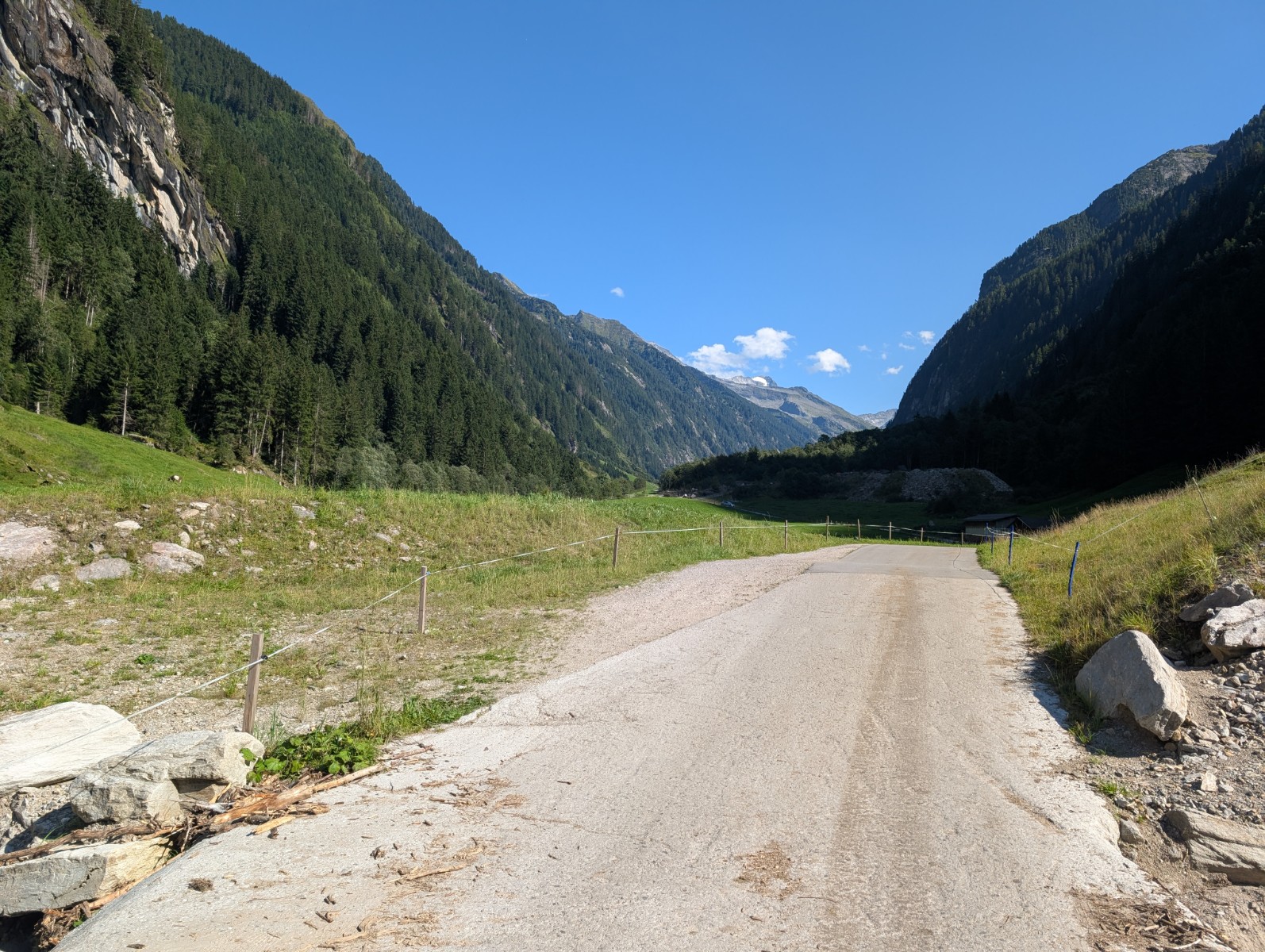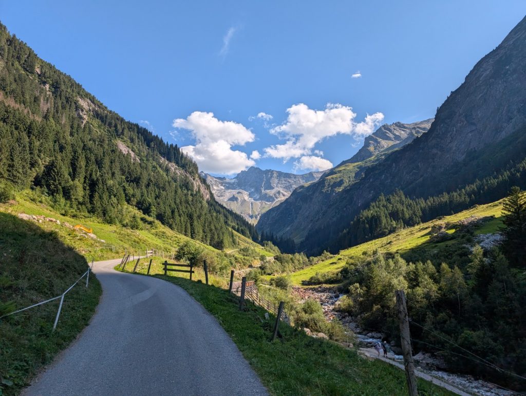 Lauffaul wie viele Urlauber glaube ich sind, waren hier nur noch wenige Leute zu Fuß unterwegs, außer mir ist eh kaum jemand so doof und fährt hier mit dem Fahrrad. Es folgte eine wunderschöne Straße komplett ohne Verkehr, nur mit Kühen das Tal weiter hinauf.