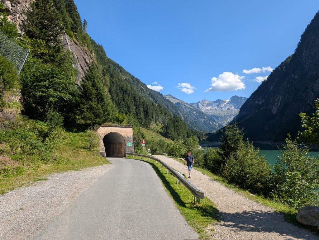 Der letzte Anstieg des Tages. 16,7km, 831hm. Also nicht so viele Höhenmeter, aber auf eine längere Strecke verteilt. Die ersten Kilometer bis zum Stausee waren zäh. Im Wald, damit schattig und ohne Aussicht. Am Stausee kam der erste Tunnel.