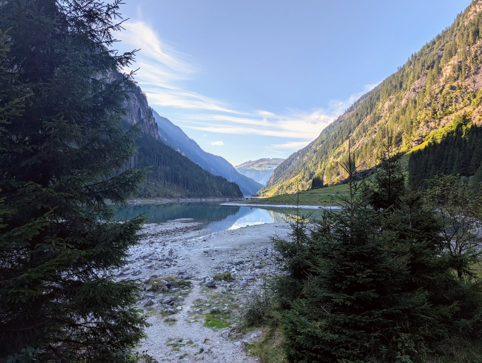 Jetzt ging’s weiter das Zillertal hoch bis nach Mayrhofen und von dort aus in Richtung Stillup Stausee. Ein Blick auf die Uhr und meine Restkilometer (15Uhr, 95 Restkilometer) verrieten mir, dass es wohl mit „ca. 18 Uhr bin ich zurück“ nichts mehr wird. Egal, es ist lang genug hell und falls ich im Campingplatzrestaurant nichts mehr zu Essen bekomme, habe ich auch noch genug im Bus. Trotzdem kam leichter „Stress“ auf.
