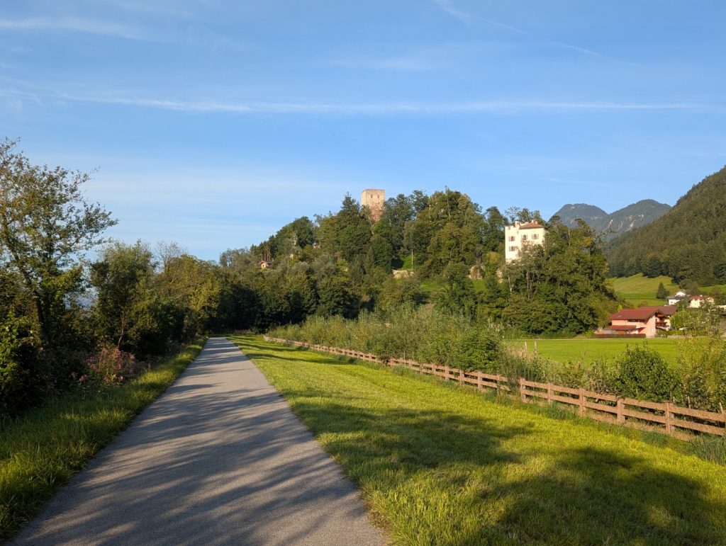 Wie schon beschrieben ist der Campingplatz länger im Schatten, das heißt es ist in der Früh echt lange kalt. Ich wollte eigentlich um 8 Uhr los, es ist aber 8:30 geworden, nachdem meine Motivation raus zu gehen bei den Temperaturen sich sehr in Grenzen hielt. Erst als ich das Inntal erreicht habe und in der Sonne fuhr konnte ich die Jacke ausziehen.