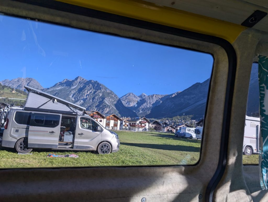 Am Bus nur zusammengepackt und einen „Camping“platz in Livigno raus gesucht. Scheinbar gibt’s hier nur noch so Wohnmobil-Abstellplätze. Egal, Hauptsache Dusche.