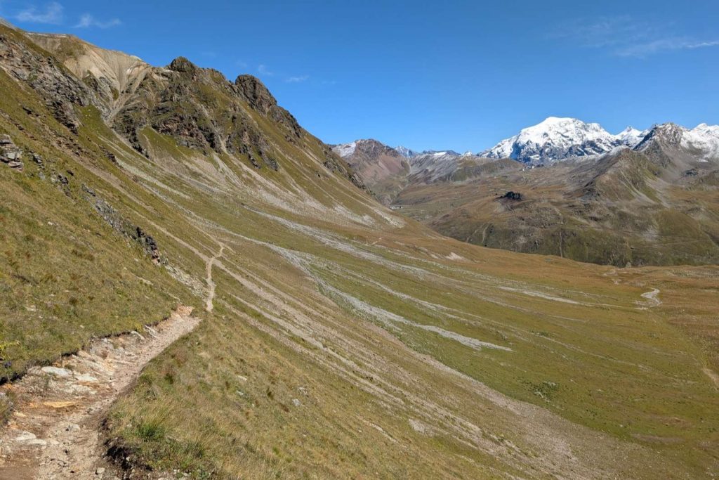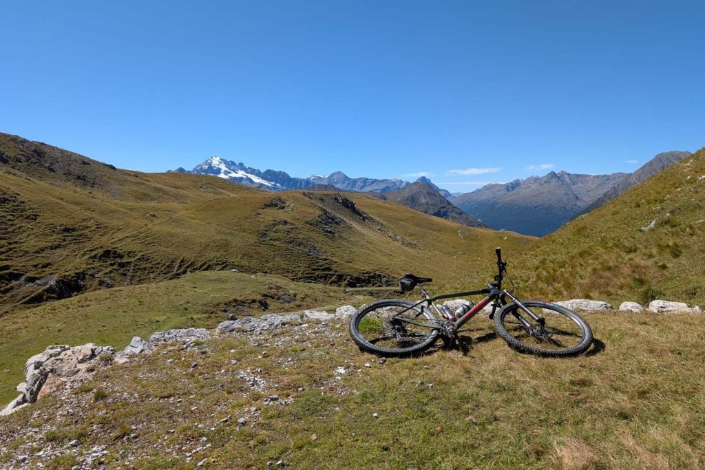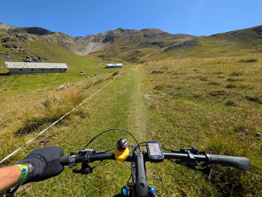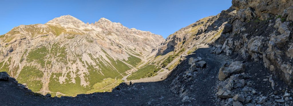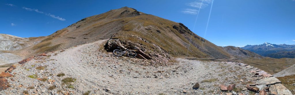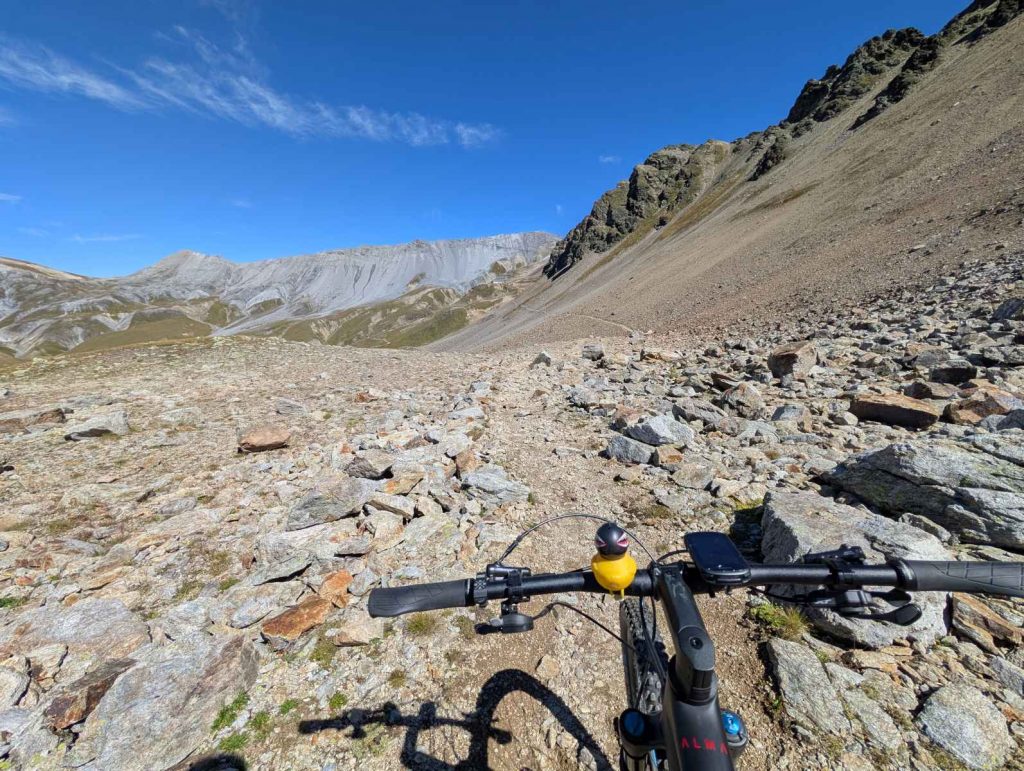 Nächste Bergkuppe. Große Überraschung: Man sah die Passhöhe vom Stilfser Joch. Und den schmalen Pfad, welcher zur Passhöhe des Umbrailpass führt. Oben noch zwei kleine Kehren schieben und dann war der komplette Weg zu 98% fahrbar, bzw. eher „rollbar“. Es ging durchgehend leicht bergab. Absoluter Hammer. In dieser Kulisse. Solche Bergs-Glücksmomente hatte ich dieses Jahr noch nie wirklich.