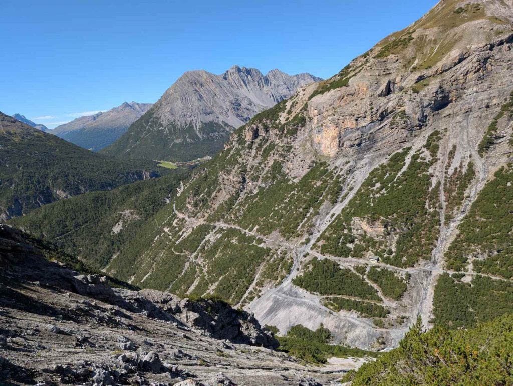 Das Wetter war heute der beste Kontrast zu gestern, den es nur geben kann. Keine Wolke, strahlender Sonnenschein, Wärme. Trotzdem fallen die Temperaturen Nachts unter 10°C und ich nahm wieder die Trailrunningweste mit warmen Klamotten mit. Es ging anfangs noch ein paar kurze Stücke über die Passstraße, dann plötzlich ganz unauffällig bin ich links von der Straße in eine Lücke zwischen der Leitplanke abgebogen und habe die Straße bis zu den letzten zwei Kilometern nicht mehr wieder gesehen.