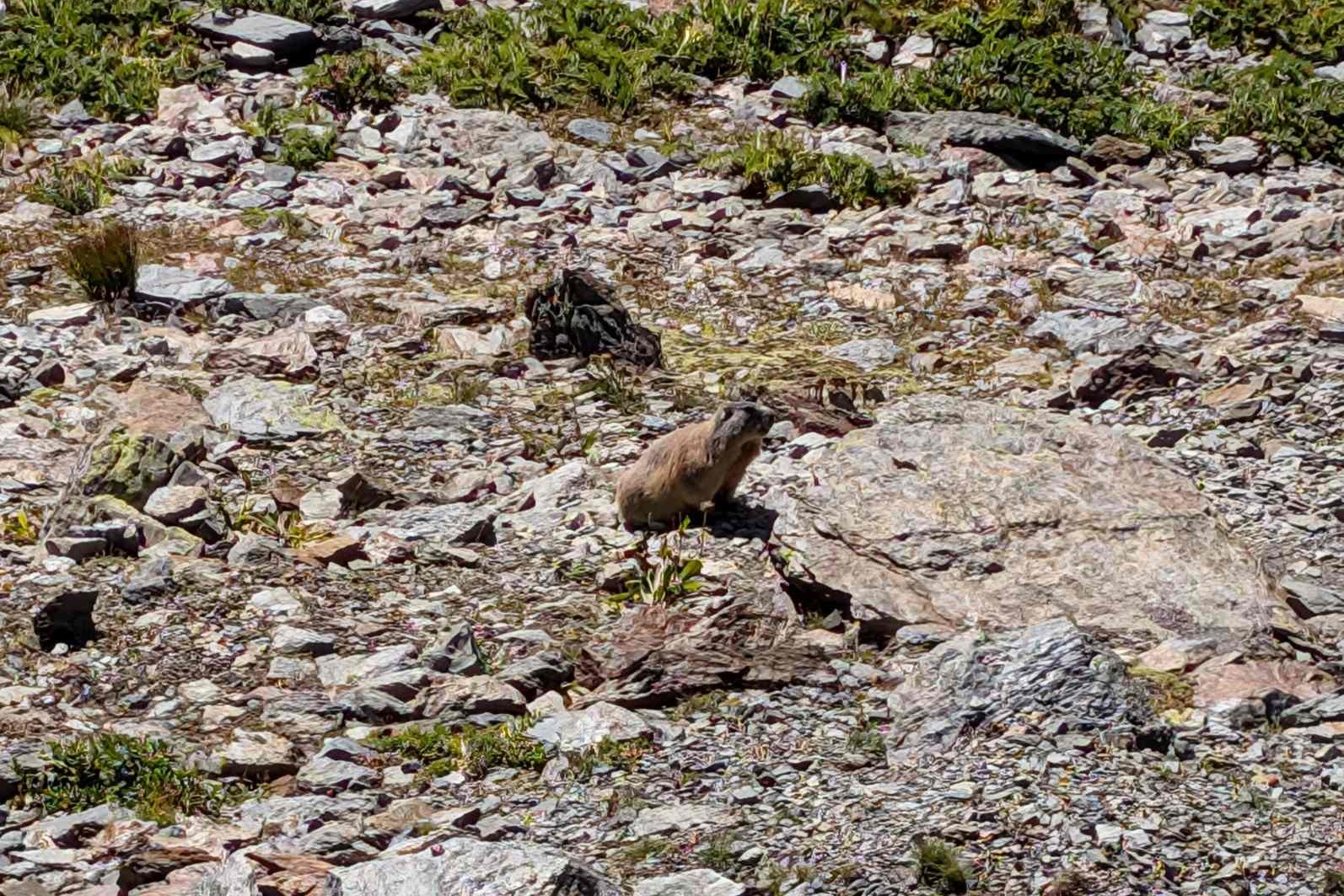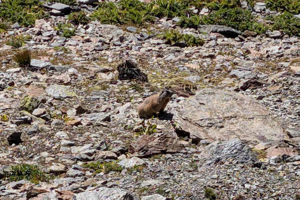 Jetzt war ich also wieder auf Teerstraße angekommen. Ich fuhr die 10 Kehren zur Passhöhe hoch. Also fast, denn die letzten Kehren bog ich auf die alte Straße ab. Die ist nur ein paar Meter von der neuen entfernt, aber eben keine Autos. Ich hörte das Pfeifen von Murmeltieren. Und nochmal. Also habe ich mal angehalten und direkt eines entdeckt. Und vermutlich sogar ein Erdmännchen.