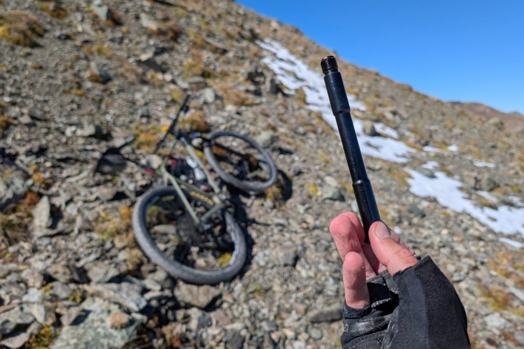 Als der Weg zu schmal und steil wurde, beschloss ich das Rad abzulegen und den Rest zu Fuß bis zum Gipfel zu laufen. Nur hatte ich kein Schloss dabei. Auch wenn hier fast niemand mehr war, wollte ich das Rad ungern einfach so liegen lassen. Also behalf ich mich dem Steckachsentrick. Ich schraubte also meine vordere Steckachse raus und nahm sie mit. So kann zumindest niemand mit dem Rad runter fahren.