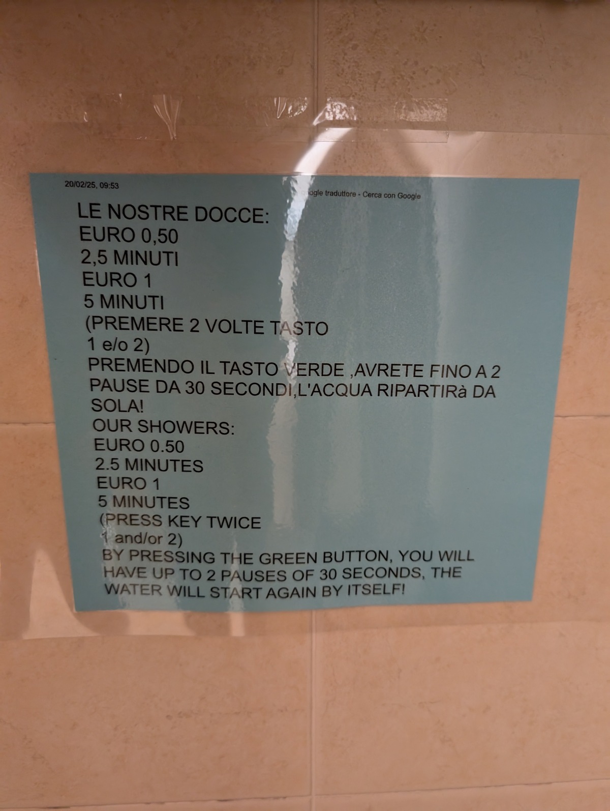 Anleitung: 50ct für 2,5 Minuten und 1€ für 5 Minuten Duschen. Geld einwerfen, Nummer der Duschkabine auswählen. Mit dem Grünen Knopf lässt sich das Wasser 2mal für 30 Sekunden stoppen.